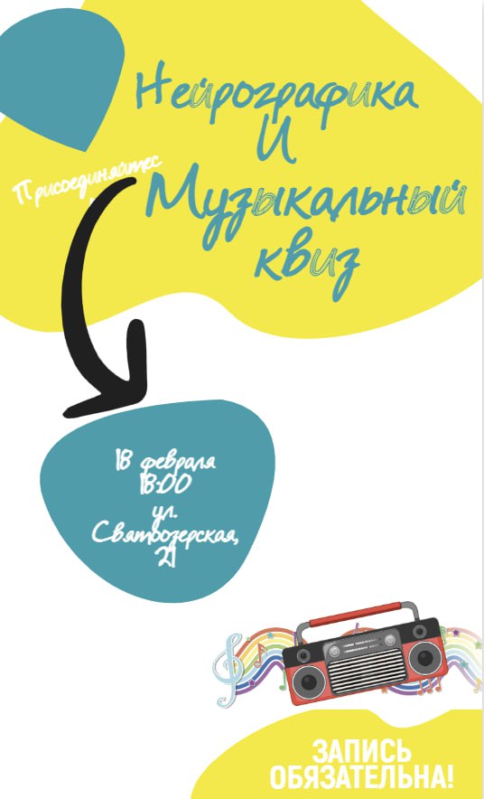 Уже в среду состоится сразу два крутых занятия: сначала нейрографический мастер-класс, а затем музыкальный квиз — будем угадывать песни по их частям(и петь по желанию)!