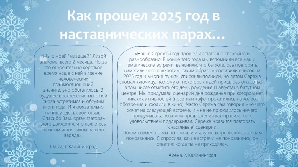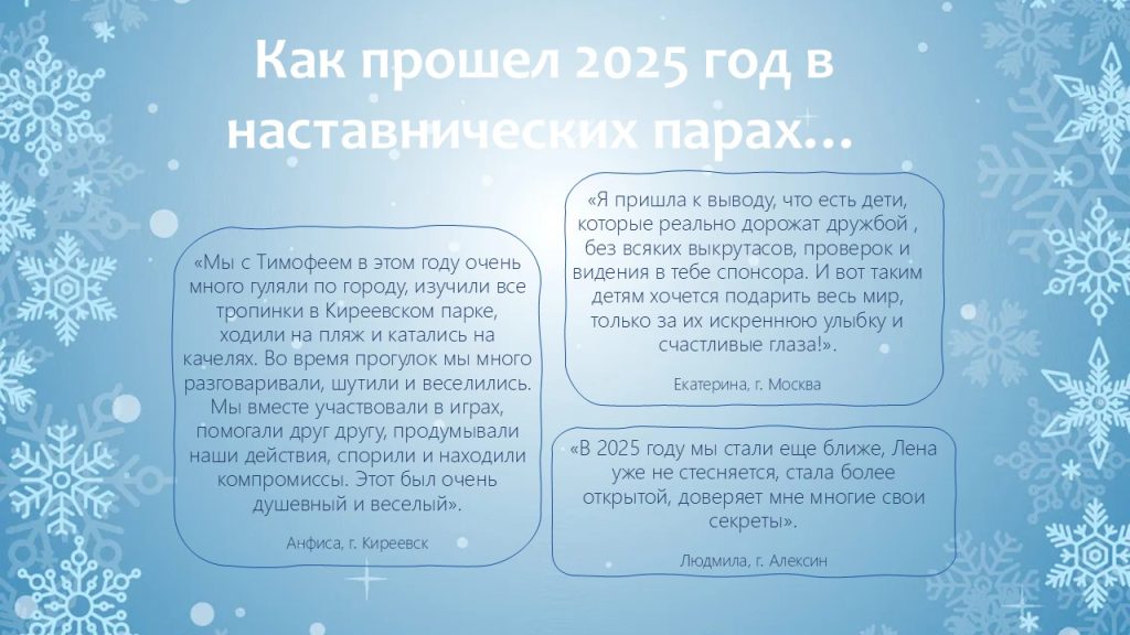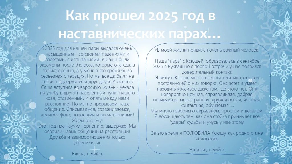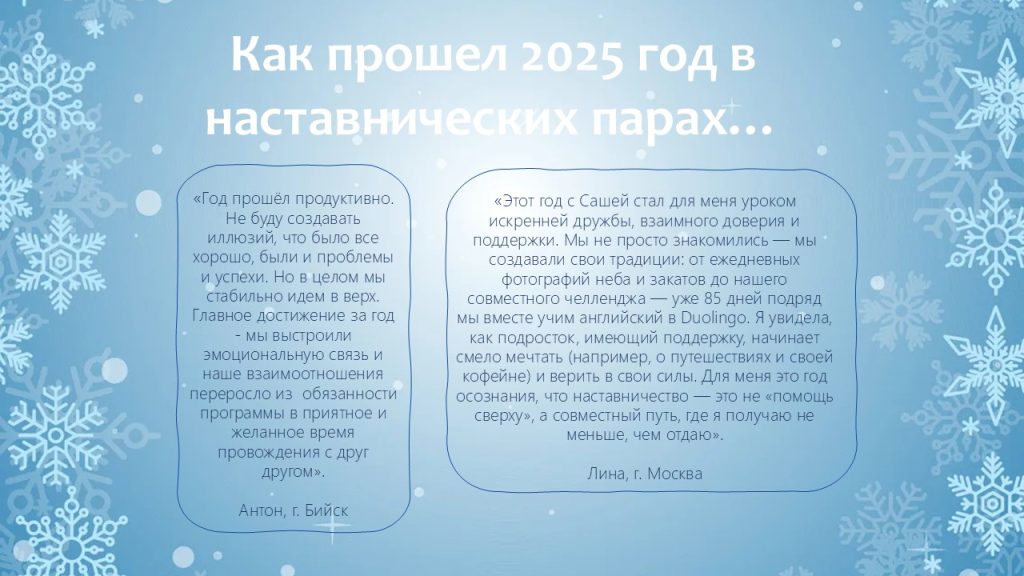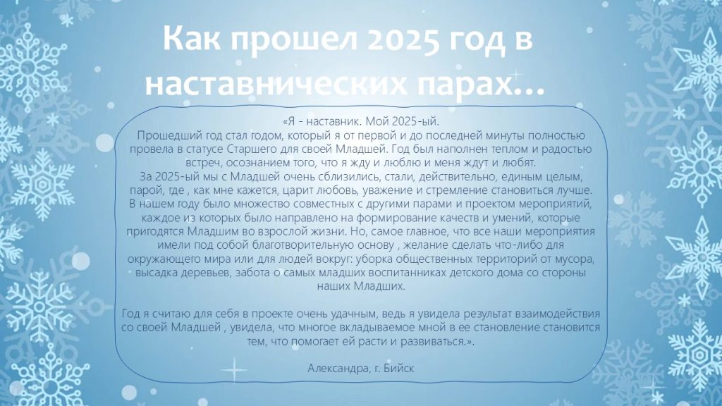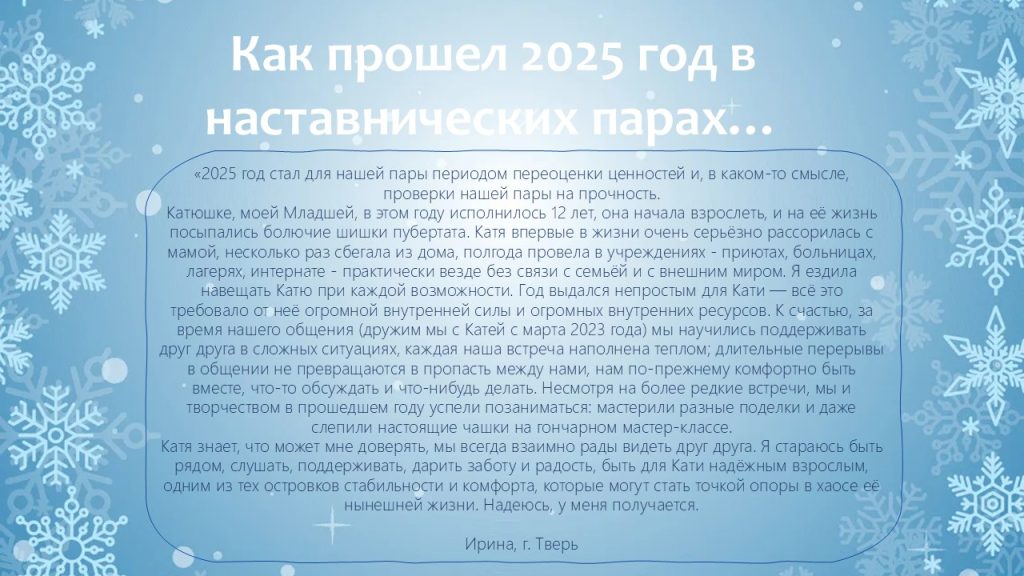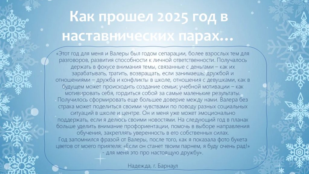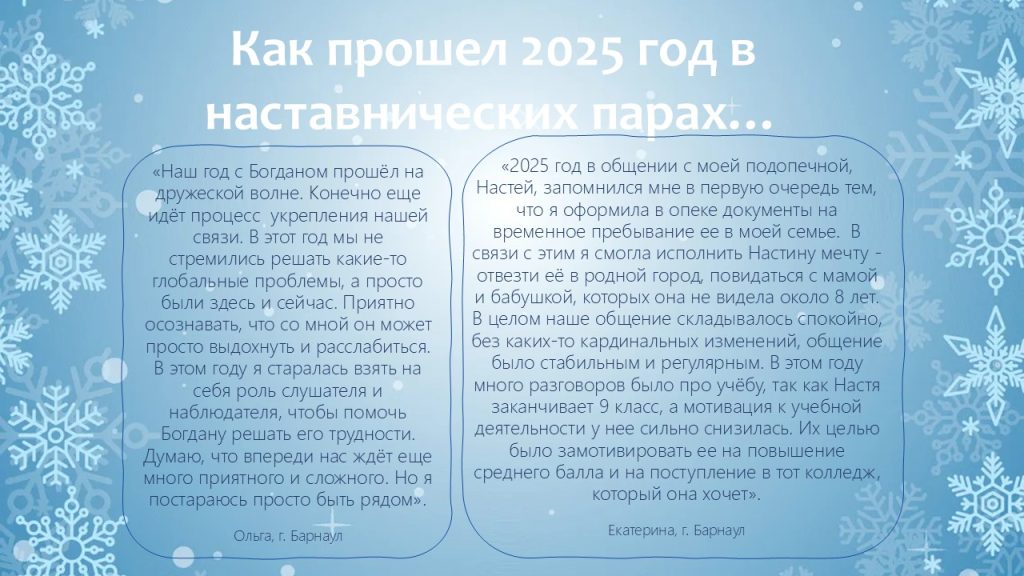 В уходящем году мы видели, как благодаря наставникам меняются взгляды ребят, как в их глазах появляется уверенность в завтрашнем дне. Это — наша общая победа!